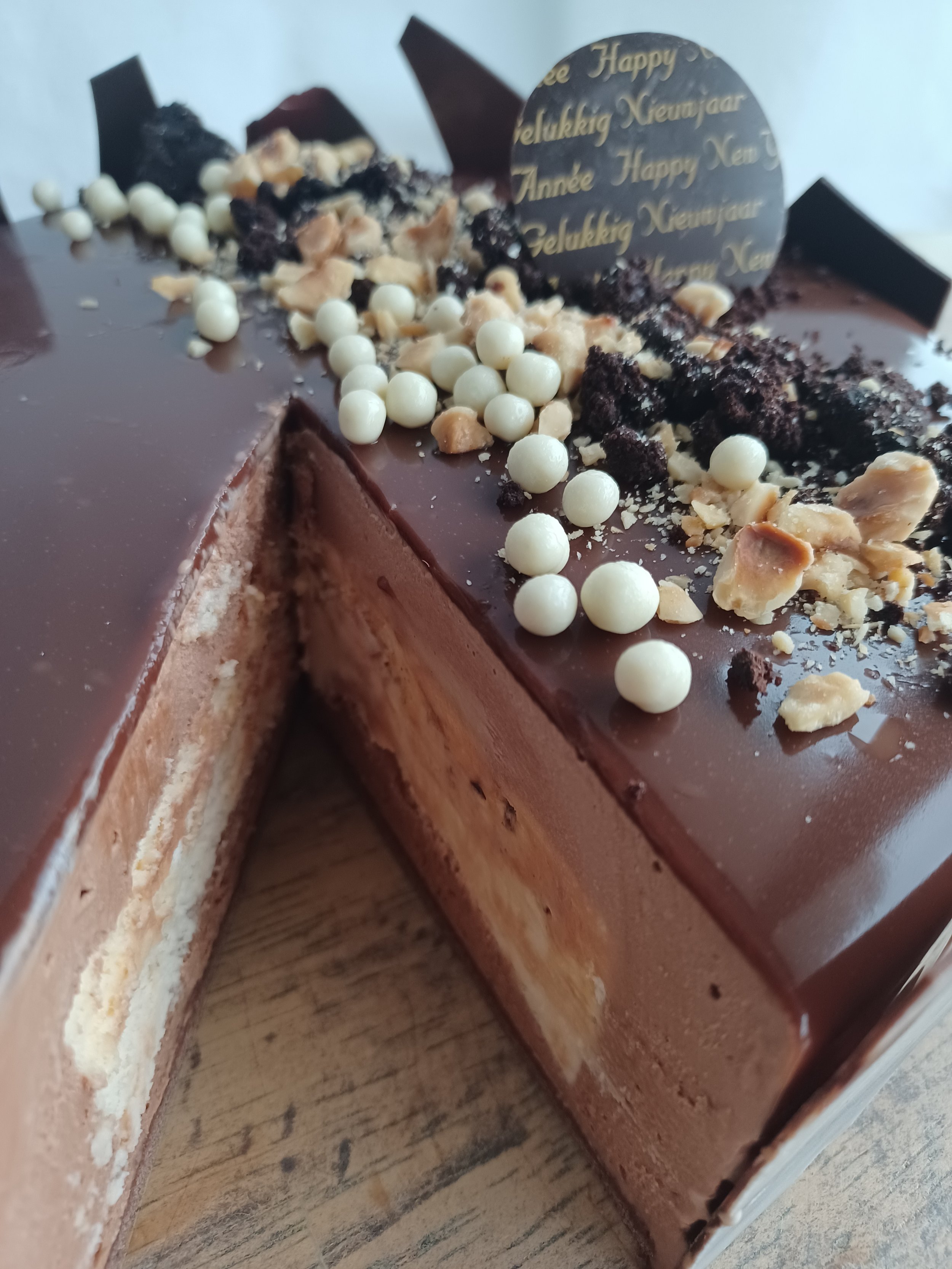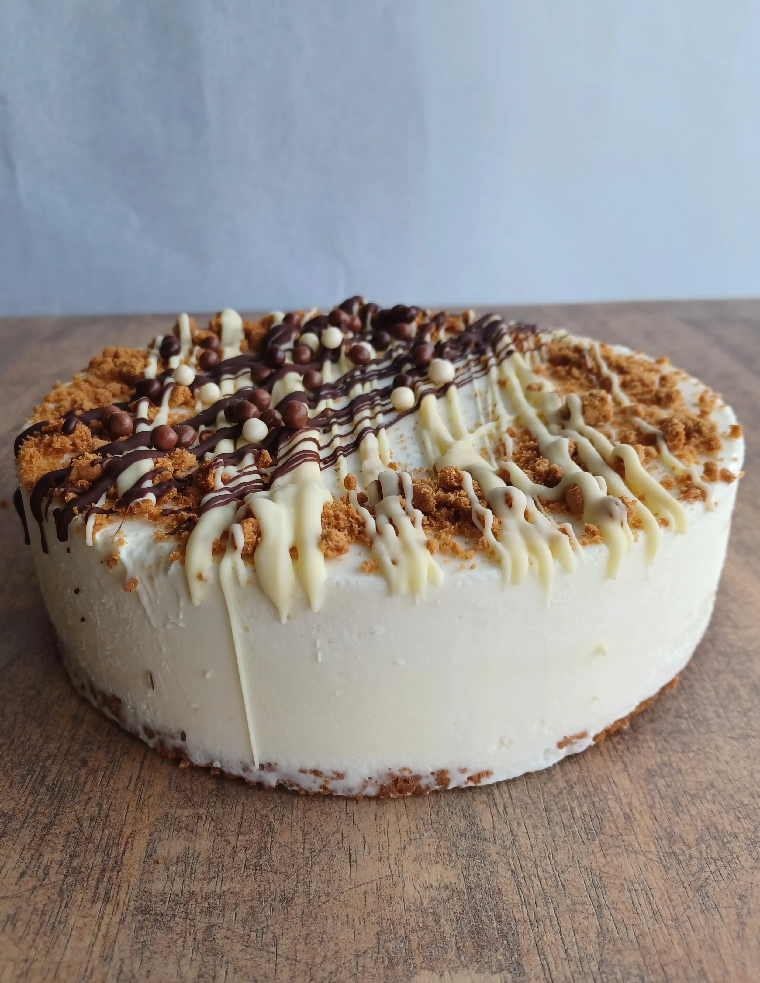 - Speculoostaart (Koekjesbodem - speculoos-ijs - speculoospasta - roomijs afgewerkt met chocoladedecoraties en crumble)